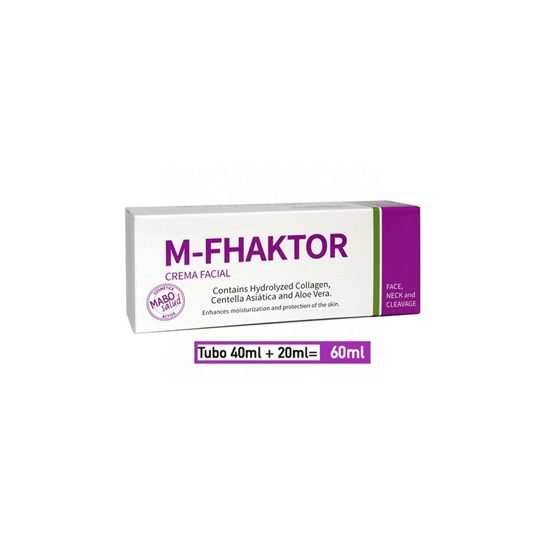 M-FHAKTOR es una crema facial con Centella Asiática (T. E. C. A), Colágeno hidrolizado y Aloe Vera que contribuye al rejuvenecimiento de la piel, ayudando a combatir las arrugas y proporcionando luminosidad a la piel. Además favorece la recuperación de las pieles reactivas al frío y al calor.