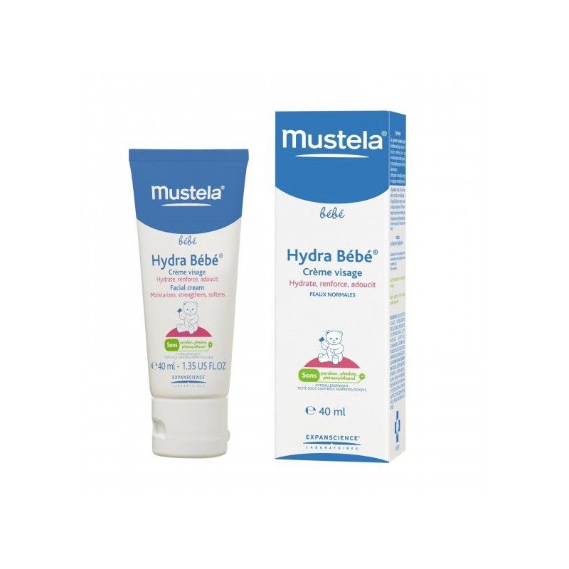 Mustela Hydra Bebé cara 40 ml. Hidrata la piel de tu bebe de manera sencilla desde el primer dia de vida, protege su cara de agresio nes extarnas gracias al aceite de jojoba, evita la sequedad en la cara gracias al aceite de almendras. Hidratación y cuidado en uno gracias a mustela.