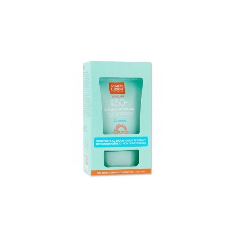 Martiderm sun care spf50+ active (d) hydra gel es un protector solar facial de textura ultraligera en gel, diseñado específicamente para piel mixta y grasa. Su fórmula oil-free y de rápida absorción ofrece una protección solar muy alta spf50+, a la vez que hidrata, matifica y regula el exceso de sebo, dejando la piel fresca y sin brillos. Características principales - protección solar muy alta spf50+ frente a rayos uva, uvb, luz azul e infrarrojos. - textura en gel ultra ligera, de rápida absorción y acabado mate. - hidratación y regulación del sebo, ideal para piel mixta y grasa. - fórmula oil-free, no comedogénica y resistente al agua. - efecto antioxidante y antipolución, gracias a sus ingredientes activos. Beneficios - protección solar de amplio espectro spf50+ contra rayos uva, uvb, luz azul e infrarrojos. - hidratación ligera sin sensación grasa. - control del brillo y del exceso de sebo, gracias a su fórmula oil-free. - previene el fotoenvejecimiento y las manchas solares. - textura fresca y de rápida absorción, perfecta para el uso diario.