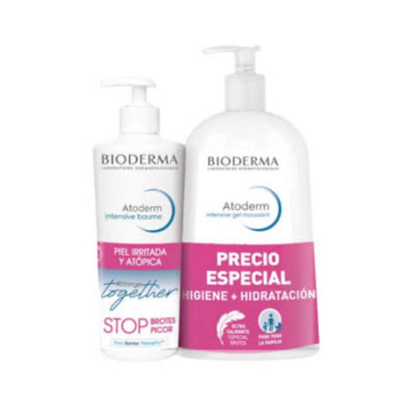 Este pack reúne dos productos complementarios de la gama bioderma “atoderm” dirigidos a pieles muy secas, irritadas o con tendencia atópica: el intensive gel moussant, un gel de limpieza sin jabón y con base limpiadora lipídica que respeta la barrera cutánea, alivia la sensación de tirantez e irritación y es apto para rostro y cuerpo. Y el intensive baume, un bálsamo ultra-nutritivo que calma el picor, refuerza la barrera cutánea gracias al complejo lipigenium™ y skin barrier therapy™, y evita el rascado en fases de brote de piel atópica. Ambos productos están formulados sin perfume, hipoalergénicos, y pensados para toda la familia (excepto prematuros).